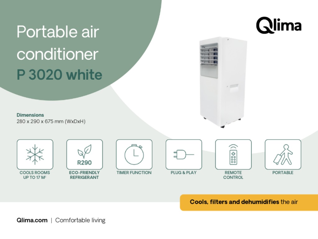 Prenosna klimatska naprava Qlima P 3020 ponaša s kompaktnimi merami ohišja (280 x 290 x 675 mm). Tako je odlična izbira za uporabo v manjših prostorih, kot so npr. počitniške prikolice ali bivalniki.